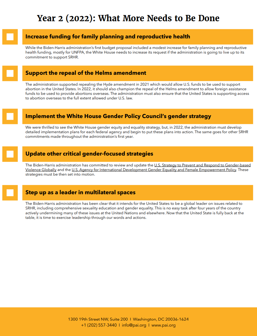 PAI, in its commitment to holding our own government accountable, acknowledges that more is needed to move beyond the positive statements and pledges of the first year. As the administration heads into its second year, it is time to put commitments into action. We look forward to continuing to advocate, encourage and collaborate with the administration and our partners to make SRHR a reality for all people.
