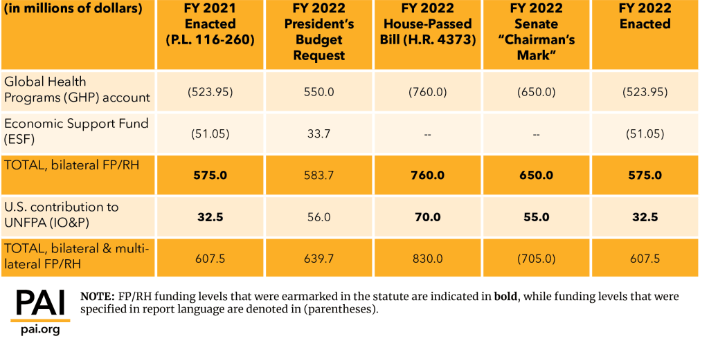 On March 15, President Biden signed a massive $1.5 trillion omnibus spending bill (H.R. 2471) that will fund federal agencies and programs through the end of fiscal year (FY) 2022 on September 30. The long delayed, 2741-page spending package fails to include any of the significant advances for sexual and reproductive health and rights (SRHR) passed by the full House and proposed by the Senate Democratic majority on the appropriations committee, specifically increased funding for international family planning and reproductive health (FP/RH) programs and the United Nations Population Fund (UNFPA) or the permanent repeal of the Global Gag Rule (GGR). Instead, due to the unrelenting demands of anti-SRHR members of Congress on the Republican side of the aisle, the bill defaults to the previous year’s funding levels and policy, essentially retaining the status quo that has persisted on these issues for more than a decade.