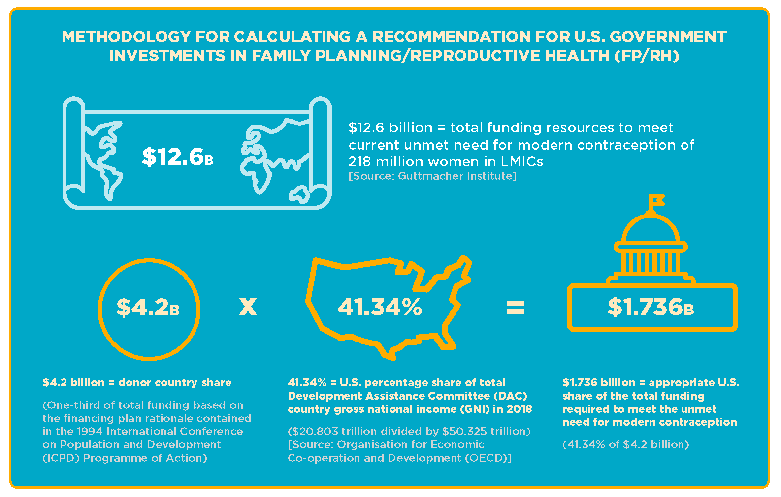 Endorsing the amount calculated, nearly 90 major national organizations have already submitted a joint request to congressional appropriators for inclusion of $1.736 billion — a near tripling of the current enacted level for bilateral and multilateral FP/RH programs — in the FY 2022 State Department and foreign operations appropriations bill. The $1.736 billion funding recommendation is derived from a July 2020 estimate by the Guttmacher Institute on the total cost of addressing the global unmet need for modern contraception of 218 million women in low- and middle-income countries (LMICs).