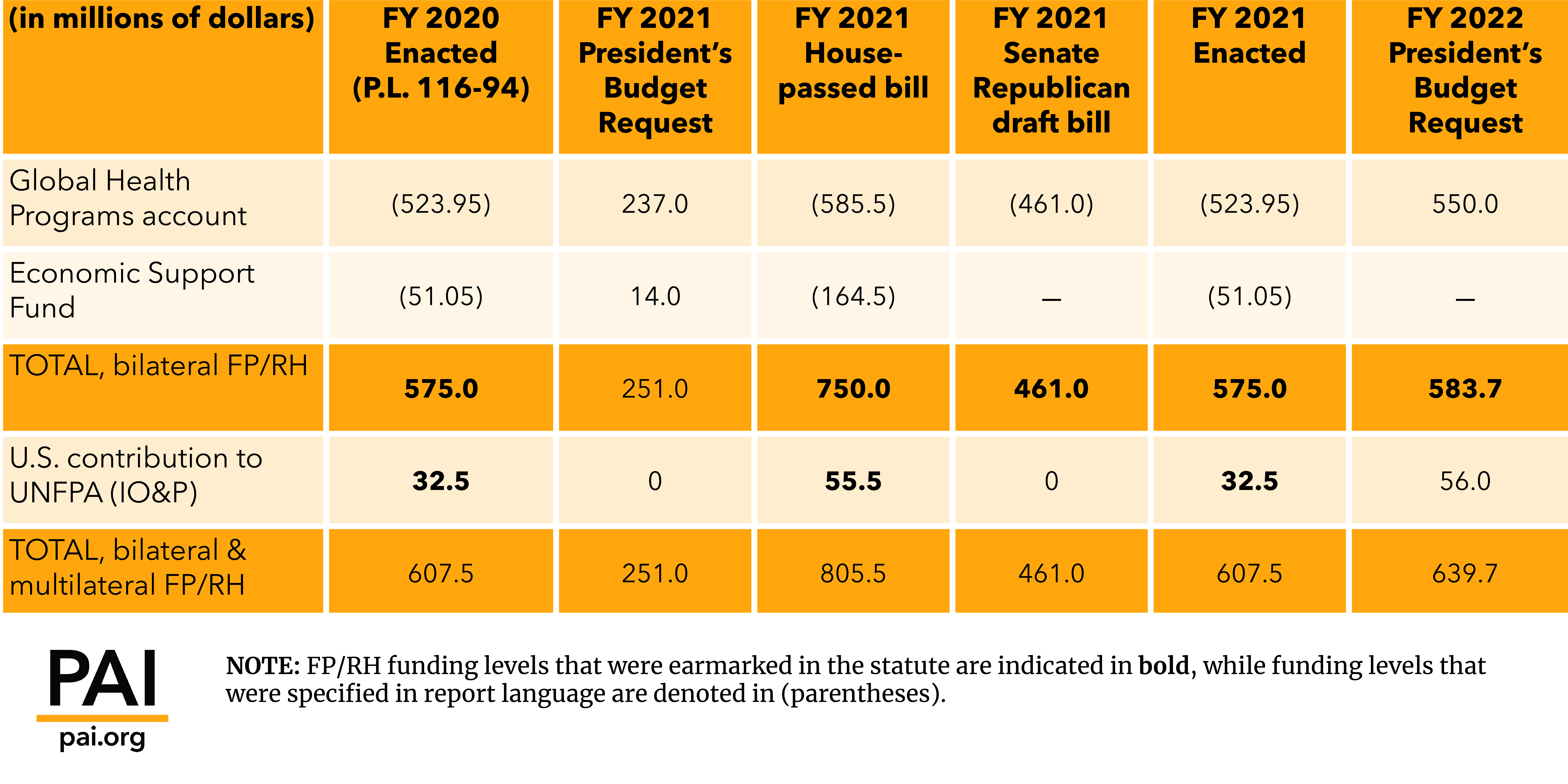 The president’s FY 2022 budget request proposes $583.7 million for bilateral FP/RH assistance, of which $550 million is allocated from within the Global Health Programs (GHP) account; and the remaining $33.7 million, presumably from the Economic Support Fund (ESF) for FP/RH activities in a very small number of strategically important countries. While the total bilateral request represents only an $8.7 million increase above the current FY 2021 enacted level, the $26.1 million increase requested within the GHP account, administered by the Office of Population and Reproductive Health (PRH) within the U.S. Agency for International Development (USAID), is a positive development.