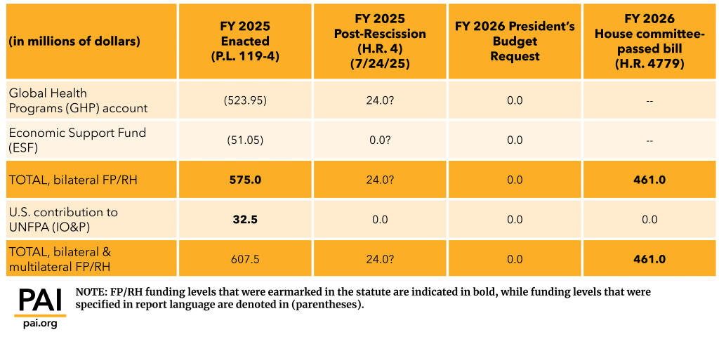 In a sharp escalation of partisan attacks on the appropriations process, congressional Republicans pushed through a controversial rescissions package (H.R. 4) that slashed $9.4 billion previously appropriated in FY 2025 for foreign assistance and public broadcasting—and which explicitly targeted international FP/RH programs.